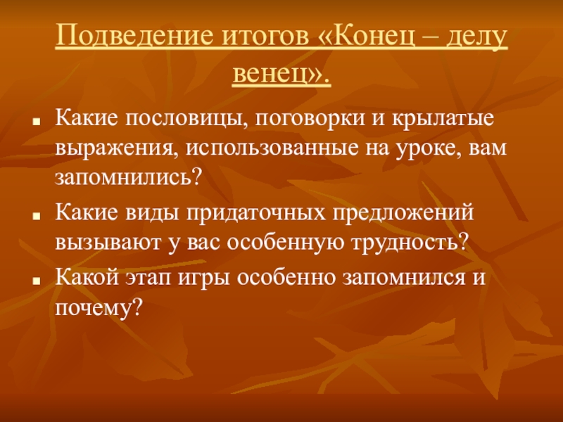 Слайд 10Подведение итогов «Конец – делу венец».