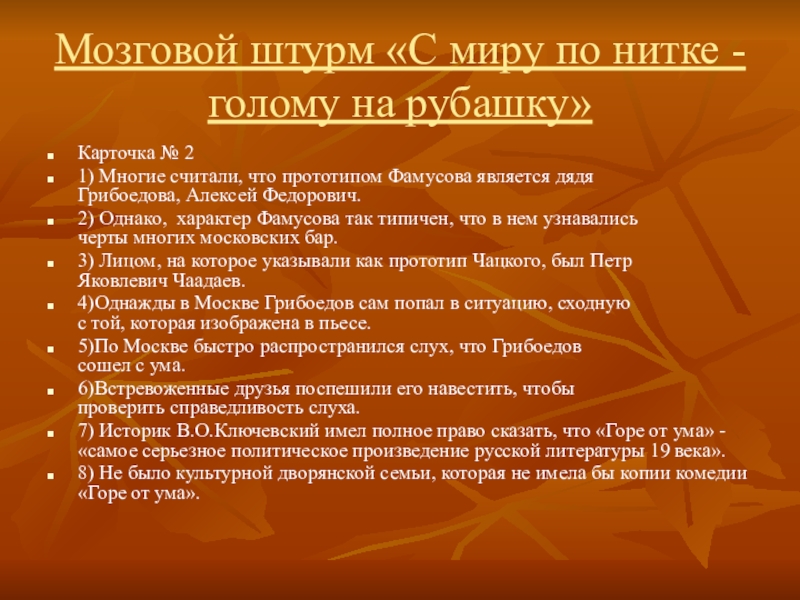 7) Историк В.О.Ключевский имел полное право сказать, что «Горе от ума» - «самое серьезное политическое произведение русской литературы 19 века».