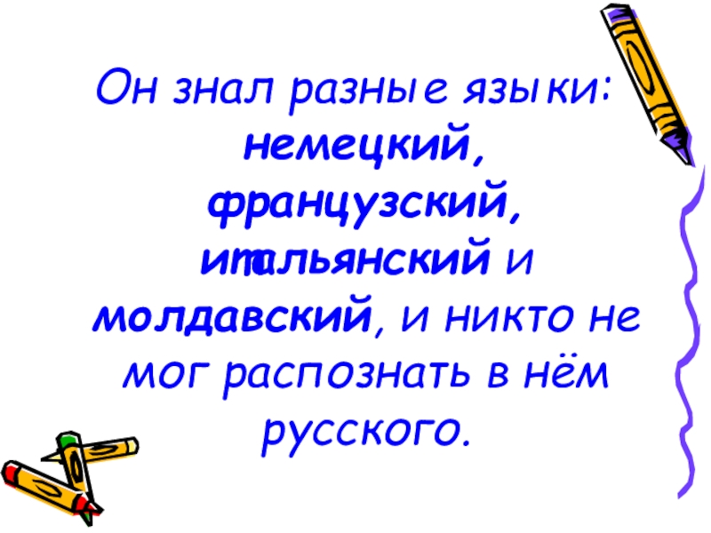 Слайд 17Он знал разные языки: немецкий, французский, итальянский и молдавский, и никто