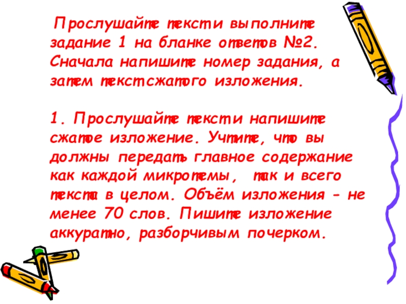 1. Прослушайте текст и напишите сжатое изложение. Учтите, что вы должны передать главное содержание как каждой микротемы, так и всего текста в целом. Объём изложения - не менее 70 слов. Пишите изложение аккуратно, разборчивым почерком.