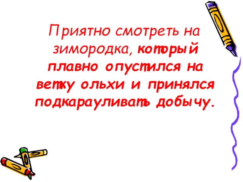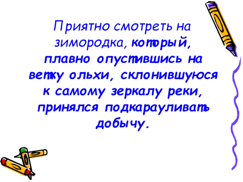 Слайд 31 Приятно смотреть на зимородка, который, плавно опустившись на ветку ольхи,