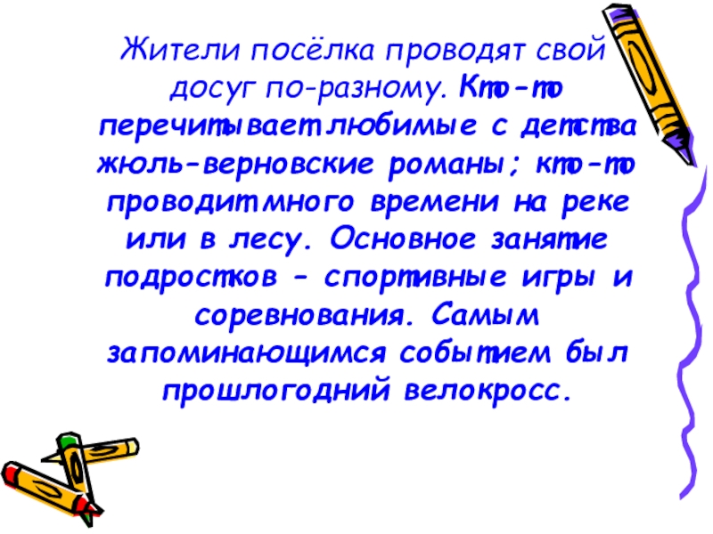 Слайд 20 Жители посёлка проводят свой досуг по-разному. Кто-то перечитывает любимые с