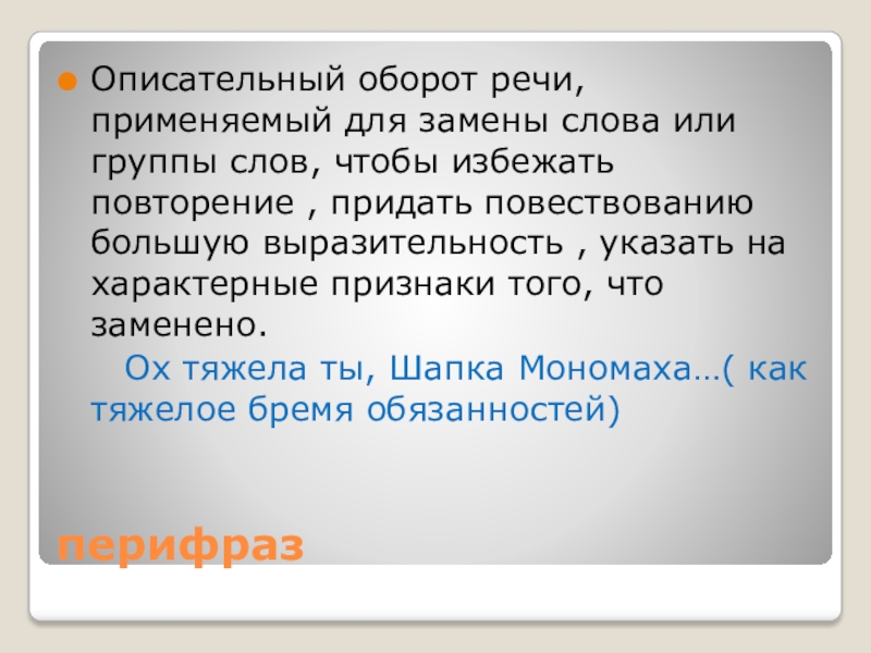 перифразОписательный оборот речи, применяемый для замены слова или группы слов, чтобы избежать повторение , придать повествованию большую