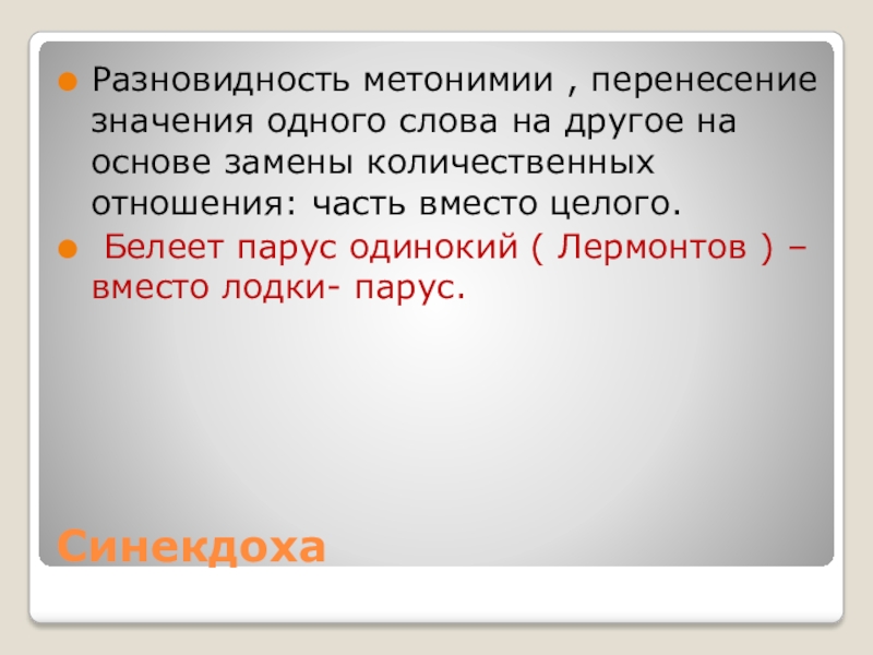 СинекдохаРазновидность метонимии , перенесение значения одного слова на другое на основе замены количественных отношения: часть вместо целого.