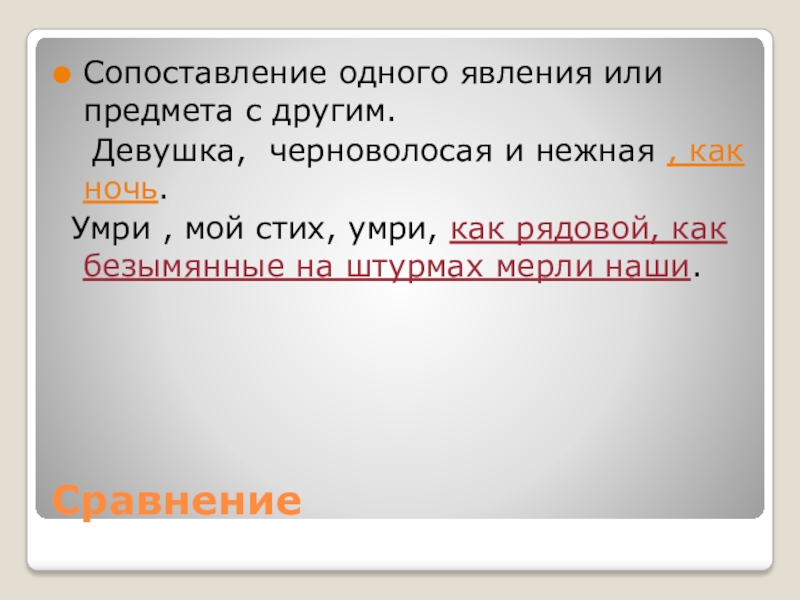 СравнениеСопоставление одного явления или предмета с другим.  Девушка, черноволосая и нежная , как ночь. Умри ,