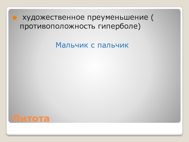 Литота художественное преуменьшение ( противоположность гиперболе)