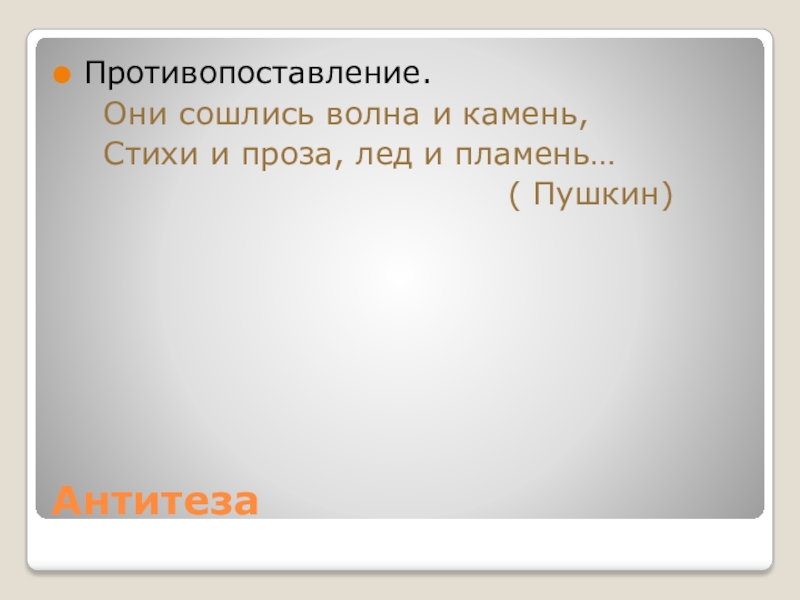 Антитеза Противопоставление.  Они сошлись волна и камень,   Стихи и проза, лед и пламень…