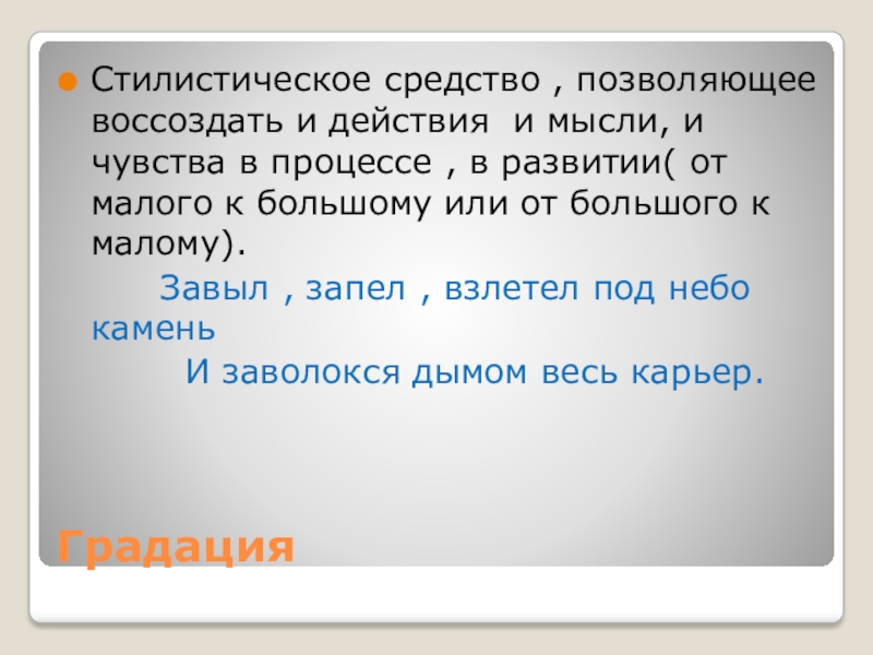 ГрадацияСтилистическое средство , позволяющее воссоздать и действия и мысли, и чувства в процессе , в развитии( от