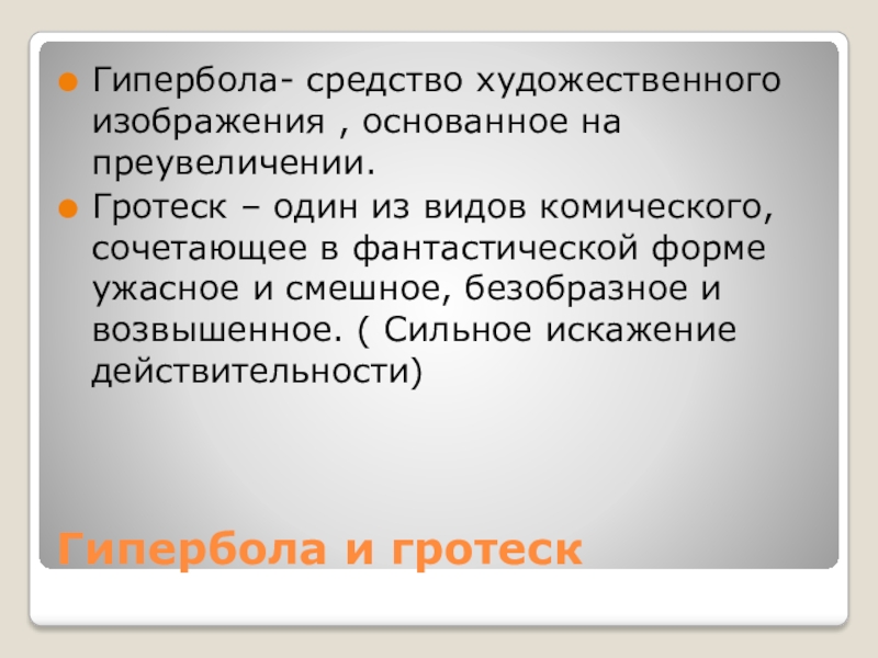 Гипербола и гротескГипербола- средство художественного изображения , основанное на преувеличении.Гротеск – один из видов комического, сочетающее в