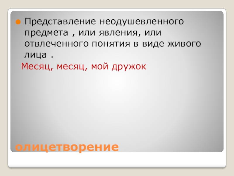 олицетворениеПредставление неодушевленного предмета , или явления, или отвлеченного понятия в виде живого лица . Месяц, месяц, мой