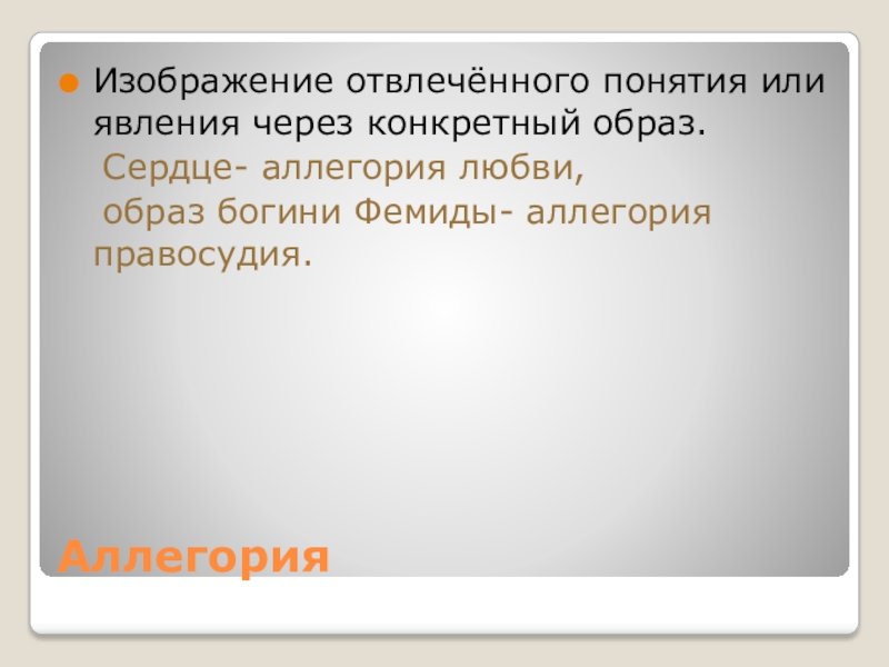 АллегорияИзображение отвлечённого понятия или явления через конкретный образ.  Сердце- аллегория любви,  образ богини Фемиды- аллегория