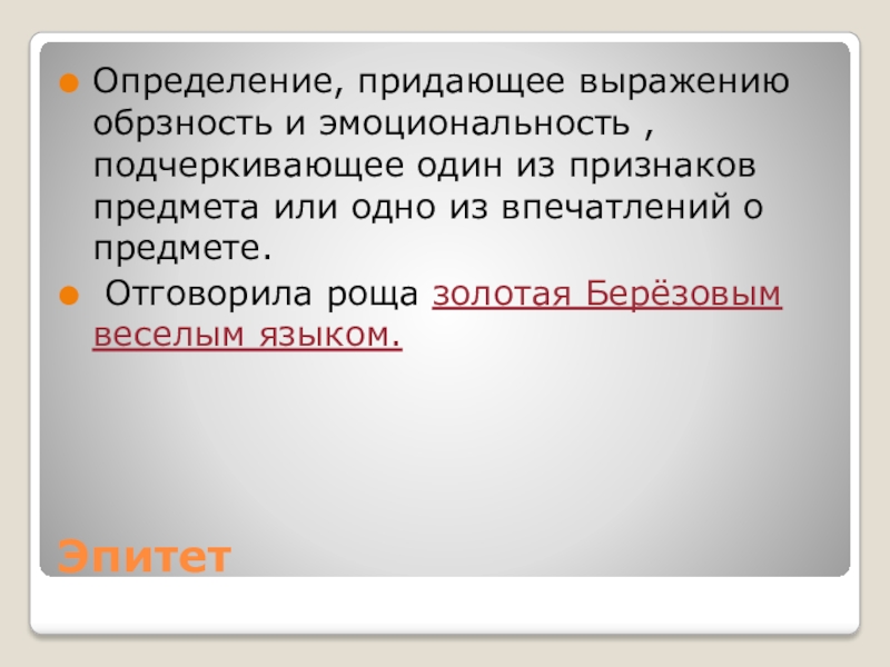 Эпитет Определение, придающее выражению обрзность и эмоциональность , подчеркивающее один из признаков предмета или одно из впечатлений