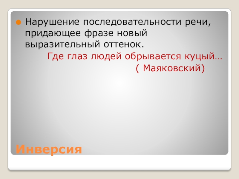 Инверсия Нарушение последовательности речи, придающее фразе новый выразительный оттенок.     Где глаз людей обрывается