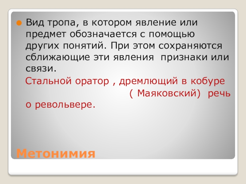 МетонимияВид тропа, в котором явление или предмет обозначается с помощью других понятий. При этом сохраняются сближающие эти