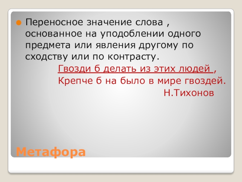 МетафораПереносное значение слова , основанное на уподоблении одного предмета или явления другому по сходству или по контрасту. Гвозди б делать из этих людей , Крепче б