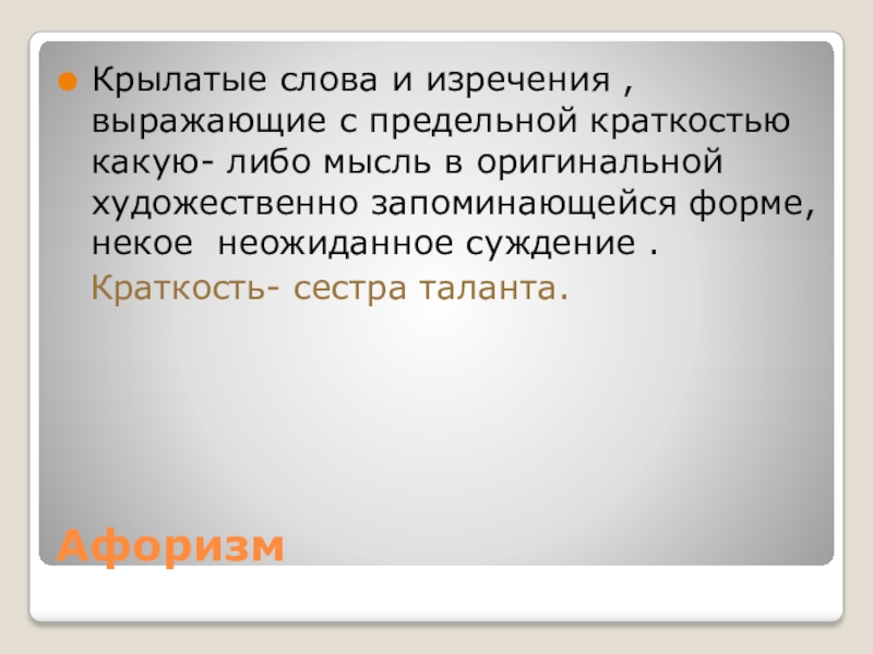 Афоризм Крылатые слова и изречения , выражающие с предельной краткостью какую- либо мысль в оригинальной художественно запоминающейся