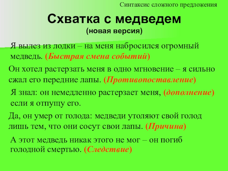 Он хотел растерзать меня в одно мгновение – я сильно сжал его передние лапы. (Противопоставление)