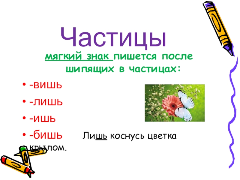 Частицы мягкий знак пишется после шипящих в частицах:-вишь-лишь-ишь-бишь   Лишь коснусь цветка крылом.