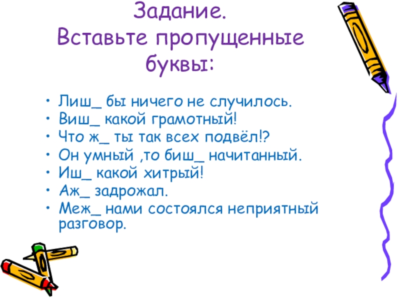 Слайд 6Задание. Вставьте пропущенные буквы:
