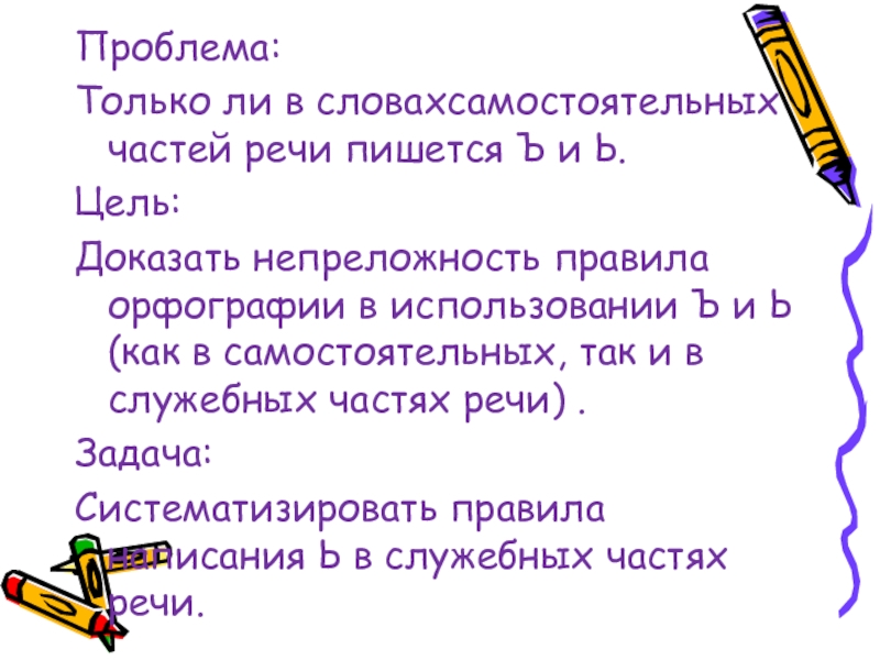 Проблема:Только ли в словахсамостоятельных частей речи пишется Ъ и Ь.Цель:Доказать непреложность правила орфографии в использовании Ъ и Ь (как в самостоятельных, так и в служебных частях речи) .Задача:Систематизировать правила написания Ь в служебных частях речи.