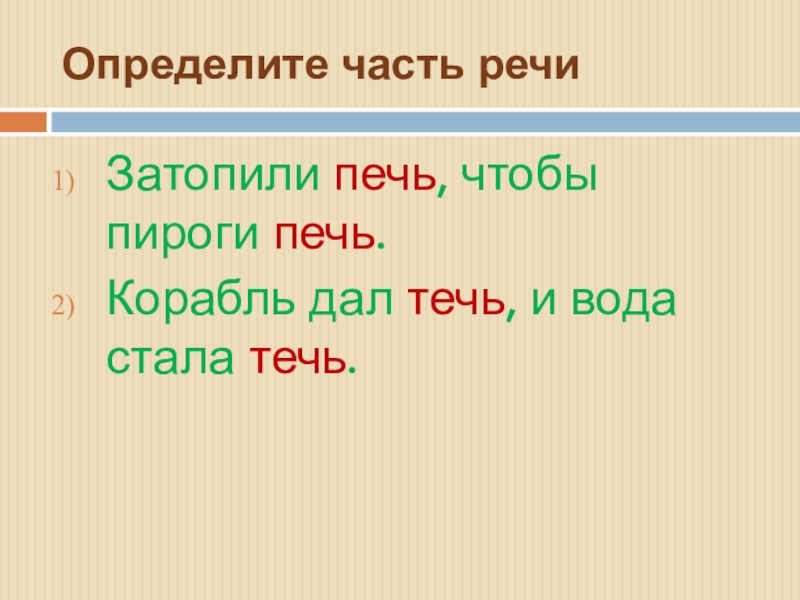 Определите часть речиЗатопили печь, чтобы пироги печь.Корабль дал течь, и вода стала течь.