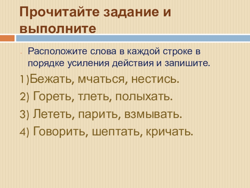 Прочитайте задание и выполнитеРасположите слова в каждой строке в порядке усиления действия и запишите.1)Бежать, мчаться, нестись.2) Гореть,