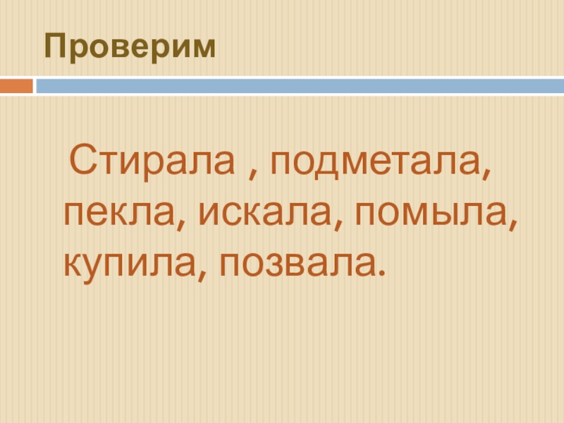 Проверим  Стирала , подметала, пекла, искала, помыла, купила, позвала.
