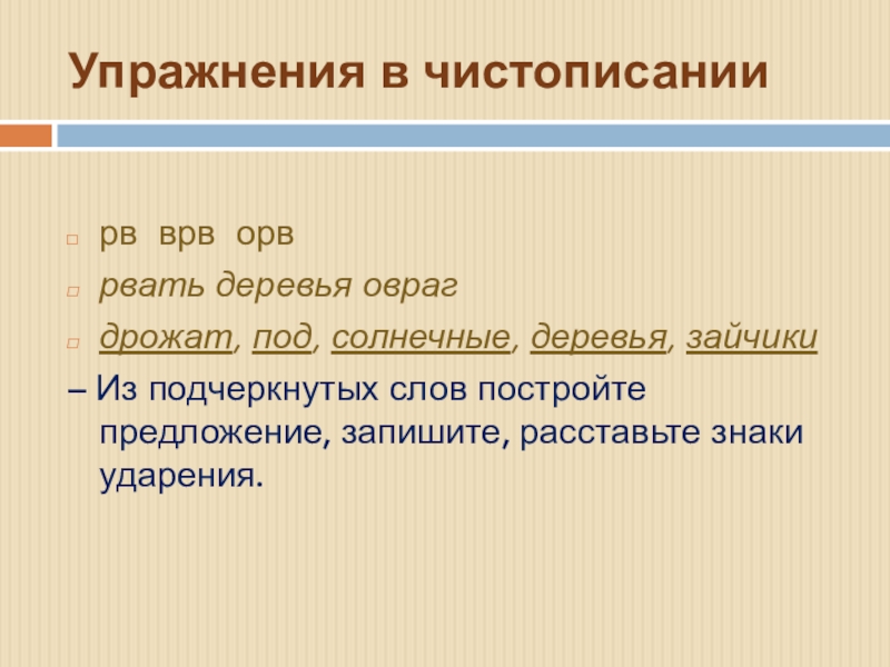 Упражнения в чистописаниирв врв орврвать деревья оврагдрожат, под, солнечные, деревья, зайчики– Из подчеркнутых слов постройте предложение, запишите, расставьте знаки ударения.