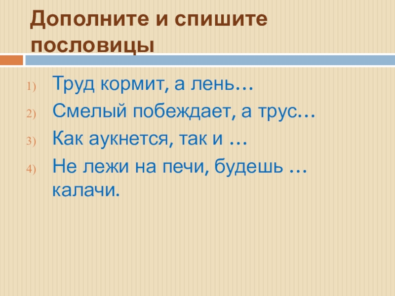Дополните и спишите пословицыТруд кормит, а лень…Смелый побеждает, а трус…Как аукнется, так и …Не лежи на печи,