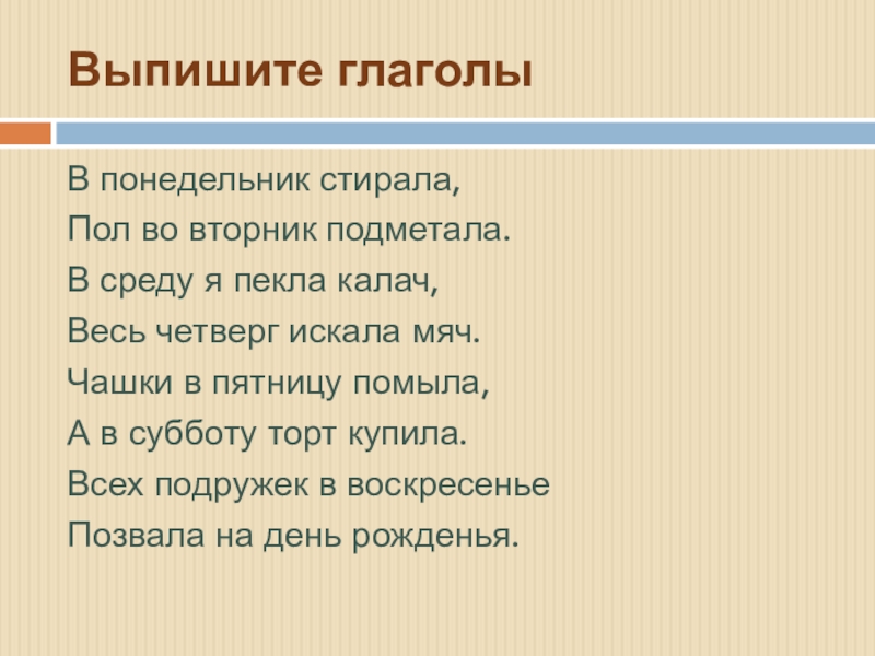 Выпишите глаголыВ понедельник стирала,Пол во вторник подметала.В среду я пекла калач,Весь четверг искала мяч.Чашки в пятницу помыла,А