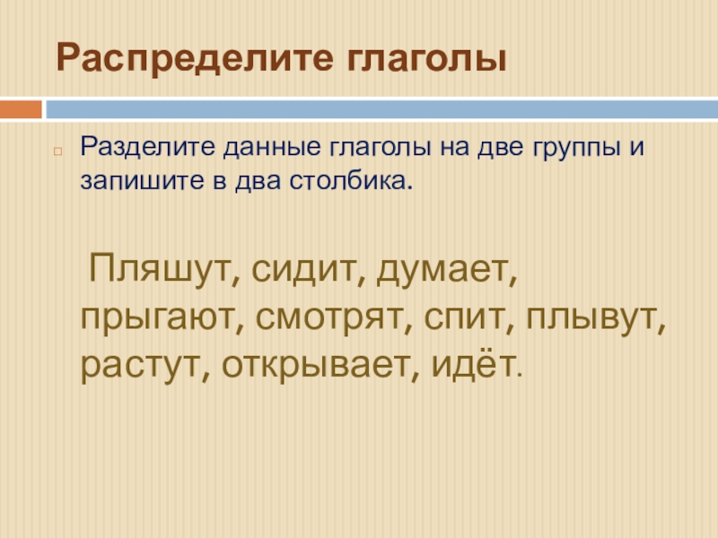 Распределите глаголыРазделите данные глаголы на две группы и запишите в два столбика.  Пляшут, сидит, думает, прыгают,