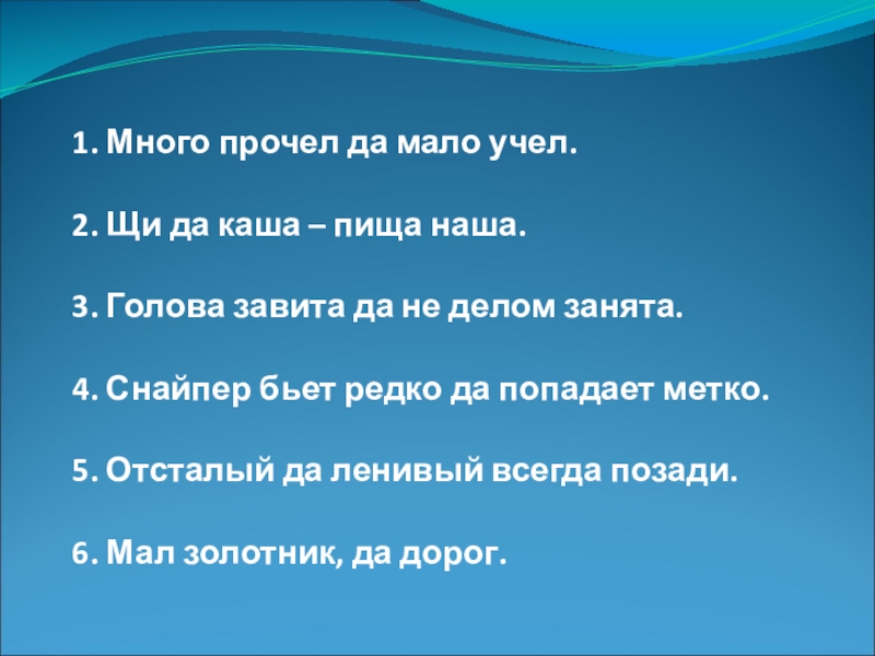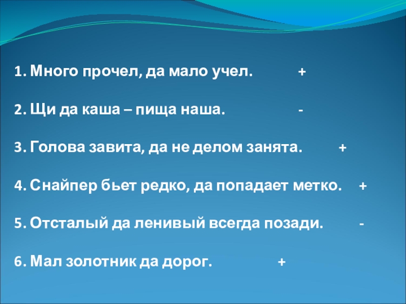 1. Много прочел да мало учел. 2. Щи да каша – пища наша. 3. Голова завита да не делом занята. 4. Снайпер бьет редко да попадает метко. 5. Отсталый да ленивый всегда