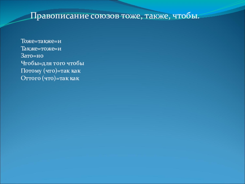 Тоже=также=иТакже=тоже=иЗато=ноЧтобы=для того чтобыПотому (что)=так какОттого (что)=так какПравописание союзов тоже, также, чтобы.