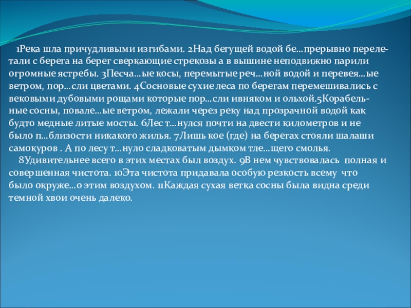 1Река шла причудливыми изгибами. 2Над бегущей водой бе…прерывно переле-тали с берега на берег сверкающие стрекозы