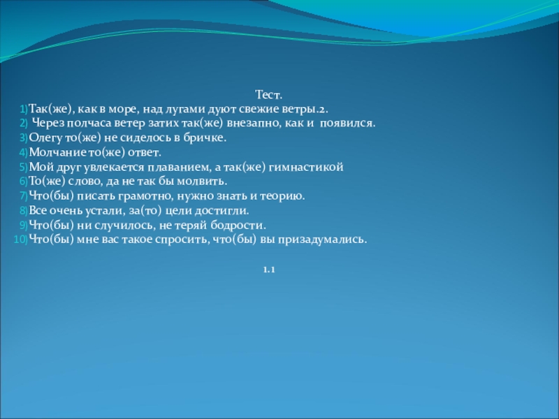 Тест. Так(же), как в море, над лугами дуют свежие ветры.2. Через полчаса ветер затих так(же) внезапно, как
