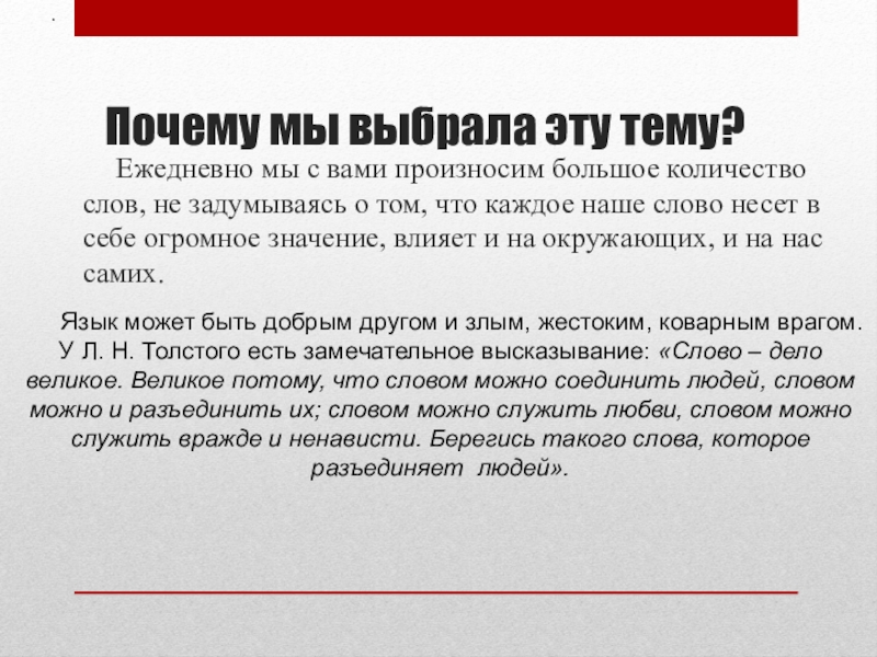Язык может быть добрым другом и злым, жестоким, коварным врагом. У Л. Н. Толстого есть замечательное высказывание: «Слово – дело великое. Великое потому, что словом можно соединить людей, словом можно и разъединить их; словом можно служить любви, словом можно служить вражде и ненависти. Берегись такого слова, которое разъединяет людей».