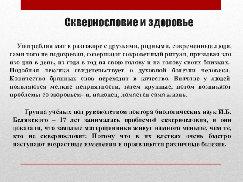 Группа учёных под руководством доктора биологических наук И.Б.Белявского – 17 лет занималась проблемой сквернословия, и они доказали, что заядлые матерщинники живут намного меньше, чем те, кто не сквернословит. Потому что в их клетках очень быстро наступают возрастные изменения и проявляются различные болезни.