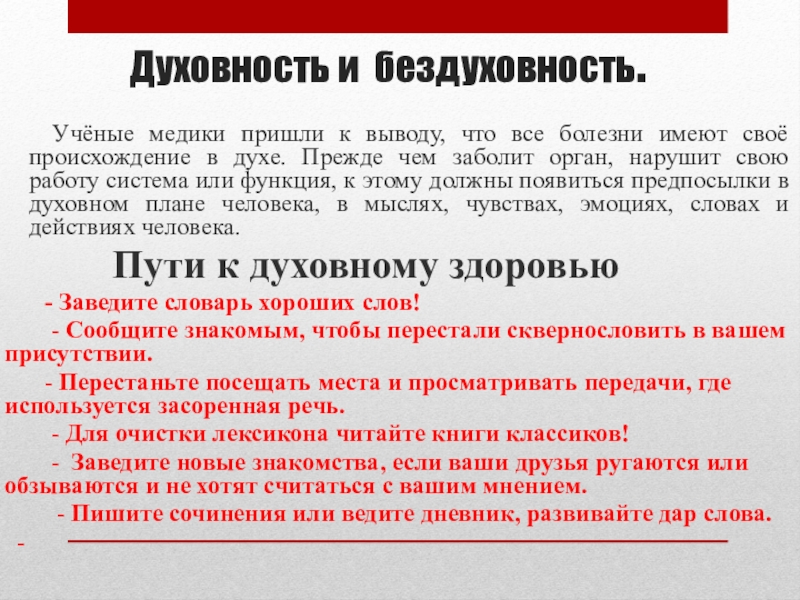 сами того не подозревая, совершают сокровенный ритуал, призывая зло изо дня в день, из года в год на свою голову и на голову своих близких. Подобная лексика свидетельствует о духовной болезни человека. Количество бранных слов переходит в качество. Вначале у людей появляются мелкие неприятности, затем крупные, потом возникают проблемы со здоровьем- и, наконец, ломается сама жизнь.