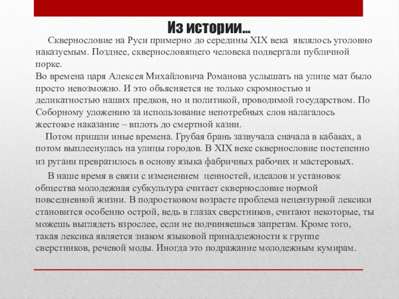 Сквернословие на Руси примерно до середины XIX века являлось уголовно наказуемым. Позднее, сквернословящего человека подвергали публичной порке.