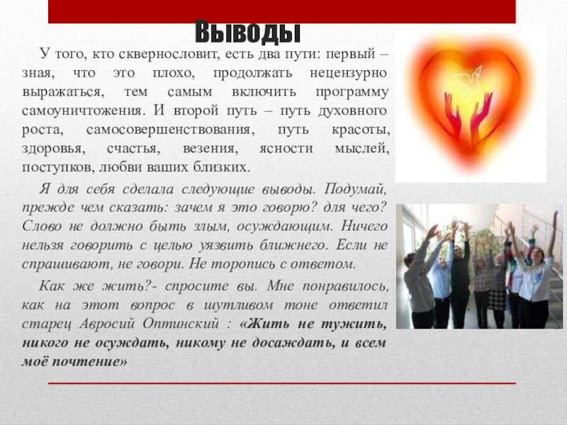 Я для себя сделала следующие выводы. Подумай, прежде чем сказать: зачем я это говорю? для чего? Слово не должно быть злым, осуждающим. Ничего нельзя говорить с целью уязвить ближнего. Если не спрашивают, не говори. Не торопись с ответом.