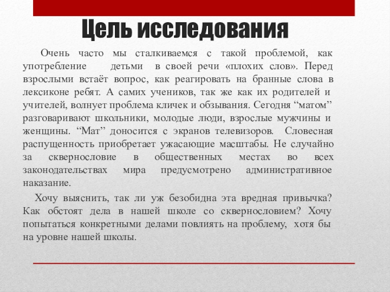 Хочу выяснить, так ли уж безобидна эта вредная привычка? Как обстоят дела в нашей школе со сквернословием? Хочу попытаться конкретными делами повлиять на проблему, хотя бы на уровне нашей школы.