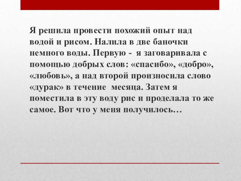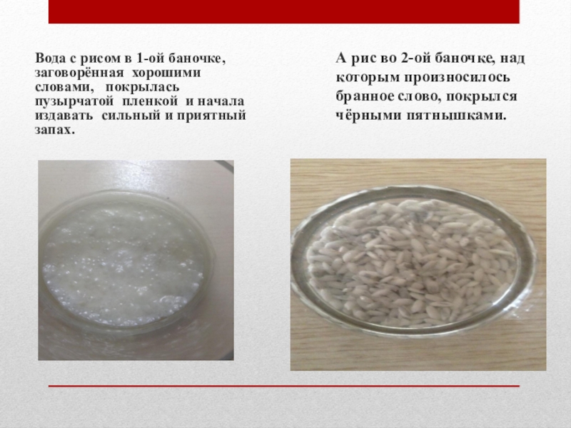 Слайд 15Вода с рисом в 1-ой баночке, заговорённая хорошими словами, покрылась