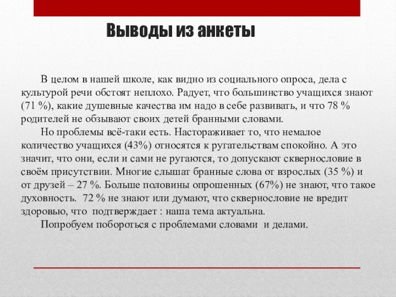целом в нашей школе, как видно из социального опроса, дела с культурой речи обстоят неплохо. Радует, что большинство учащихся знают (71 %), какие душевные качества им надо в себе развивать, и что 78 % родителей не обзывают своих детей бранными словами.