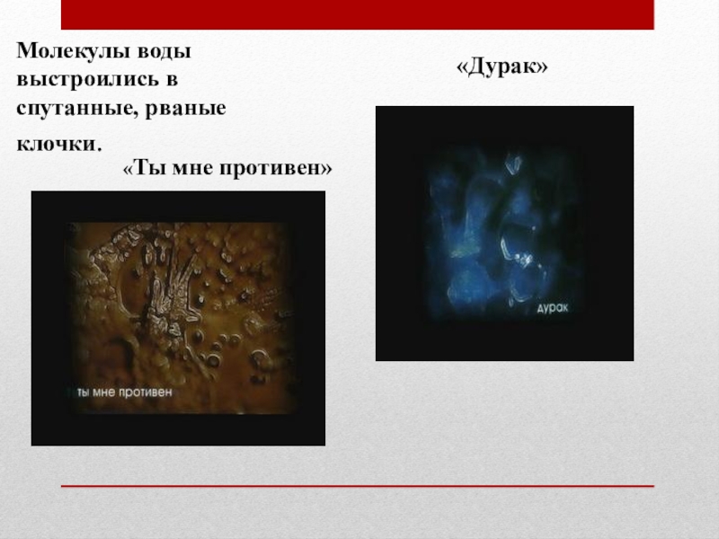 Слайд 13Молекулы воды выстроились в спутанные, рваные клочки.