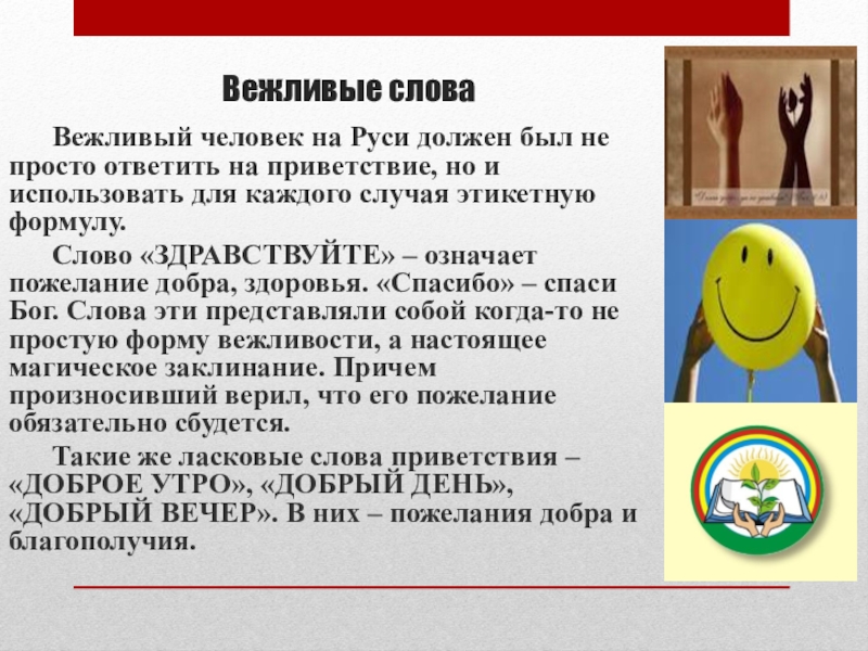Слово «ЗДРАВСТВУЙТЕ» – означает пожелание добра, здоровья. «Спасибо» – спаси Бог. Слова эти представляли собой когда-то не простую форму вежливости, а настоящее магическое заклинание. Причем произносивший верил, что его пожелание обязательно сбудется.