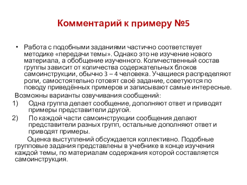 Оценка выступлений обсуждается коллективно. Подобные групповые задания представлены в учебнике в конце изучения каждой темы, по материалам содержания которой составляется самоинструкция.
