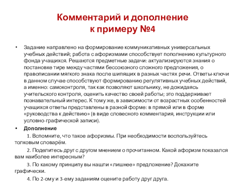 учебных действий; работа с афоризмами способствует пополнению культурного фонда учащихся. Решаются предметные задачи: актуализируются знания о постановке тире между частями бессоюзного сложного предложения, о правописании мягкого знака после шипящих в разных частях речи. Ответы-ключи в данном случае способствуют формированию регулятивных учебных действий, а именно: самоконтроля, так как позволяют школьнику, не дожидаясь учительского контроля, оценить качество своей работы; это поддерживает познавательный интерес. К тому же, в зависимости от возрастных особенностей учащихся ответы представлены в разной форме: в прямой или в форме «руководства к действию» (в виде словесного комментария, инструкции или условно-графической записи).