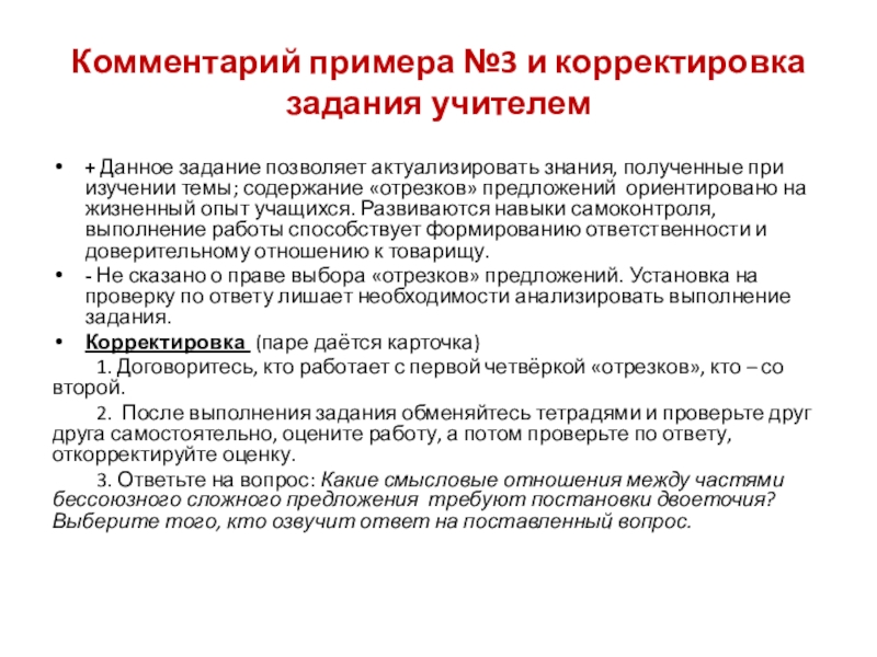 Слайд 15Комментарий примера №3 и корректировка задания учителем
