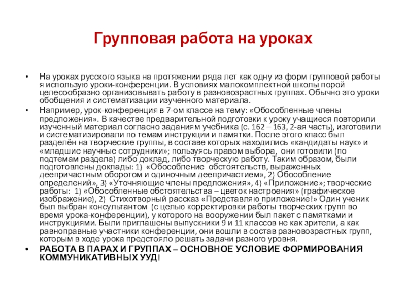 как одну из форм групповой работы я использую уроки-конференции. В условиях малокомплектной школы порой целесообразно организовывать работу в разновозрастных группах. Обычно это уроки обобщения и систематизации изученного материала.