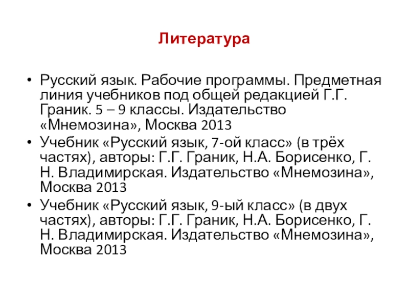 Учебник «Русский язык, 7-ой класс» (в трёх частях), авторы: Г.Г. Граник, Н.А. Борисенко, Г.Н. Владимирская. Издательство «Мнемозина», Москва 2013
